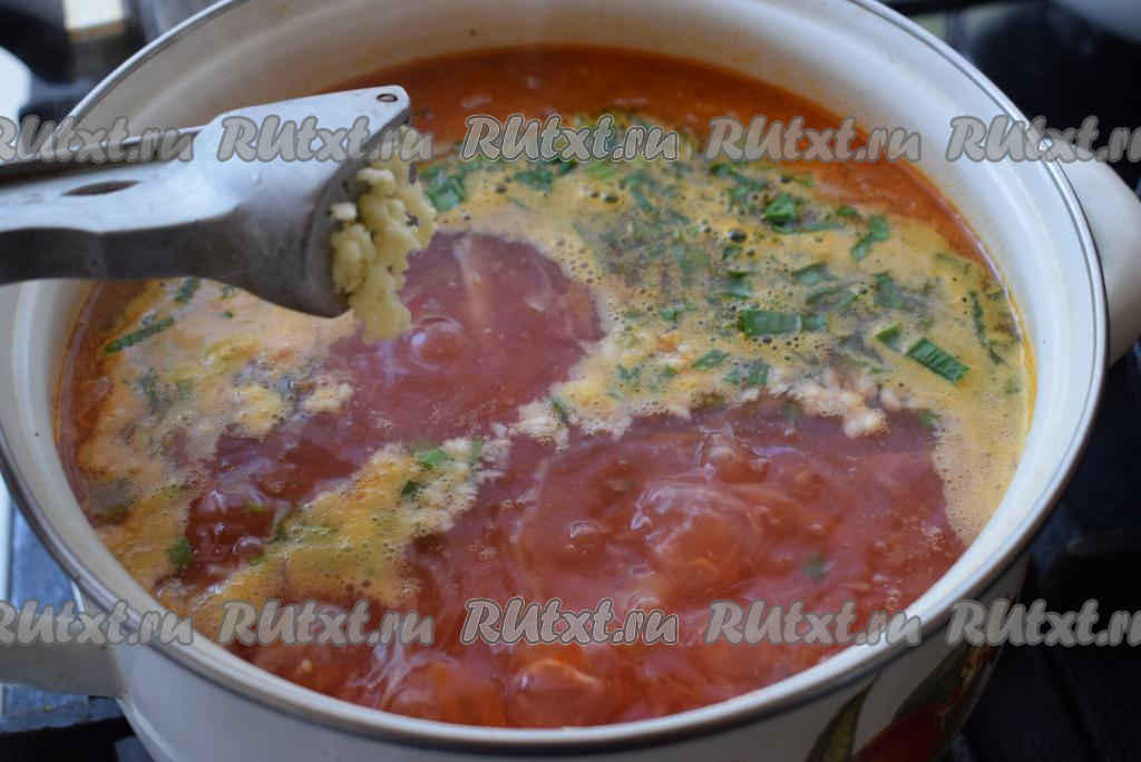 Как только борщ закипит, добавляем к нему пропущенный через пресс чеснок и рубленную зелень.