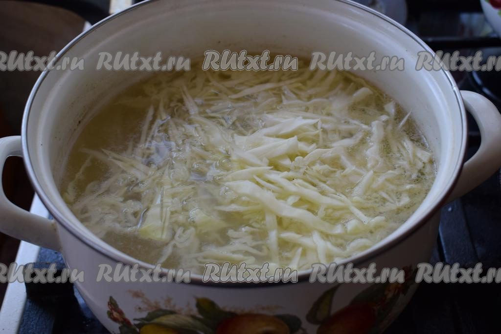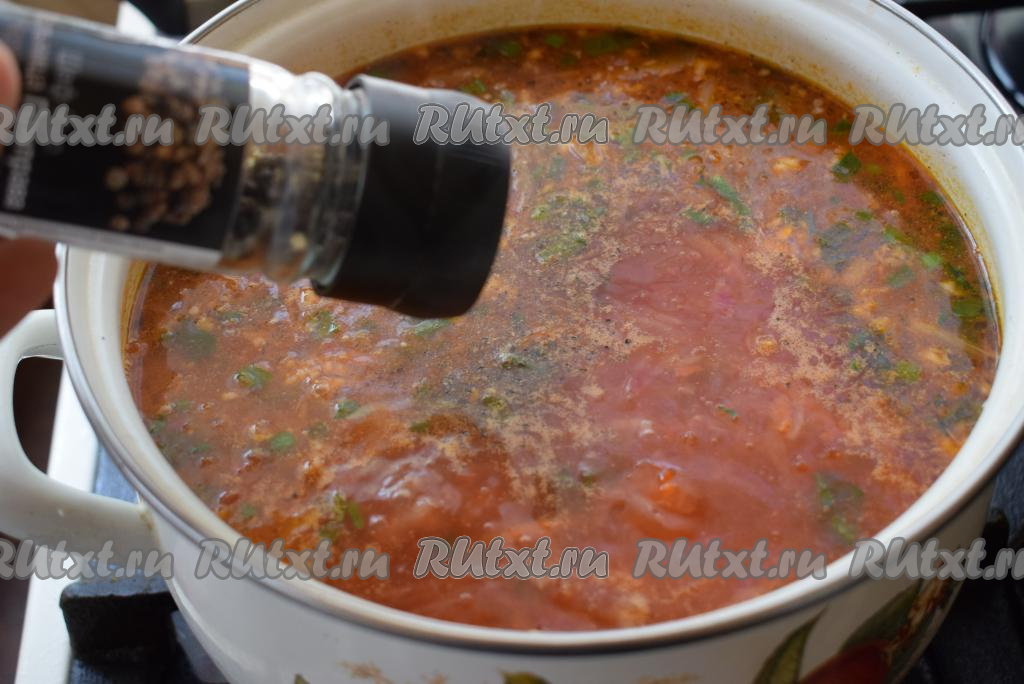 Солим наш будущий борщ по вкусу. К практически готовому картофелю добавляем капусту и провариваем ее с момента закипания около 5-7 минут (если капуста нежная - вполне хватит и 3-4 минут). Капуста в борще не должна стать мягкой и разваренной.