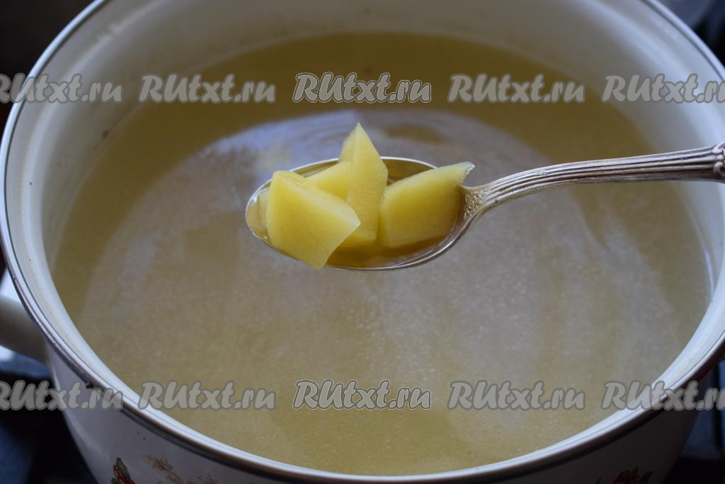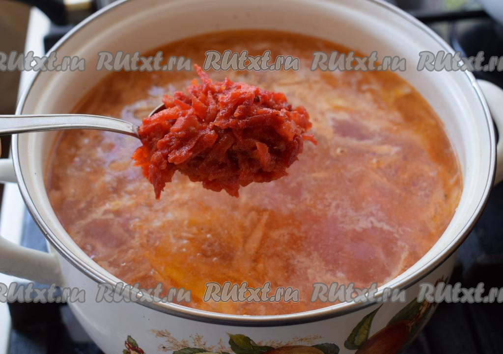 Когда картофель станет мягким, достаем, примерно, 2 столовые ложки картофеля и разминаем его в пюре, добавляем пюре обратно в бульон (делаем это для того, чтобы наш борщ стал более насыщенным).