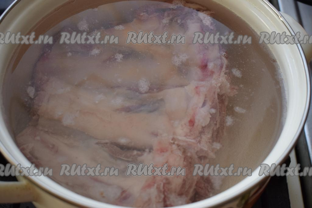 Для начала сварим насыщенный говяжий бульон. Для этого кладем в холодную воду промытое мясо говядины на кости (именно мясо с косточкой дает наваристый и ароматный бульон, который нам нужен).