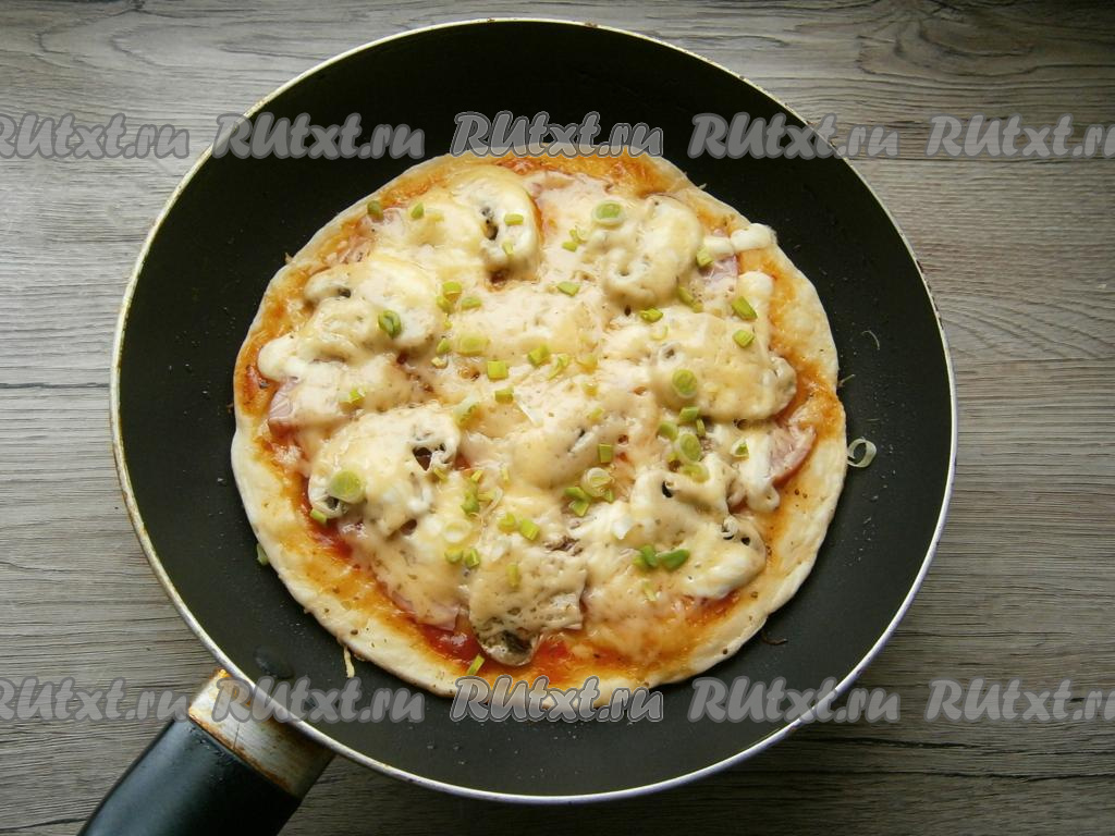 Поставить сковороду на небольшой огонь, накрыть крышкой. Готовить ленивую пиццу около 10 минут, затем посыпать измельченным зеленым луком.