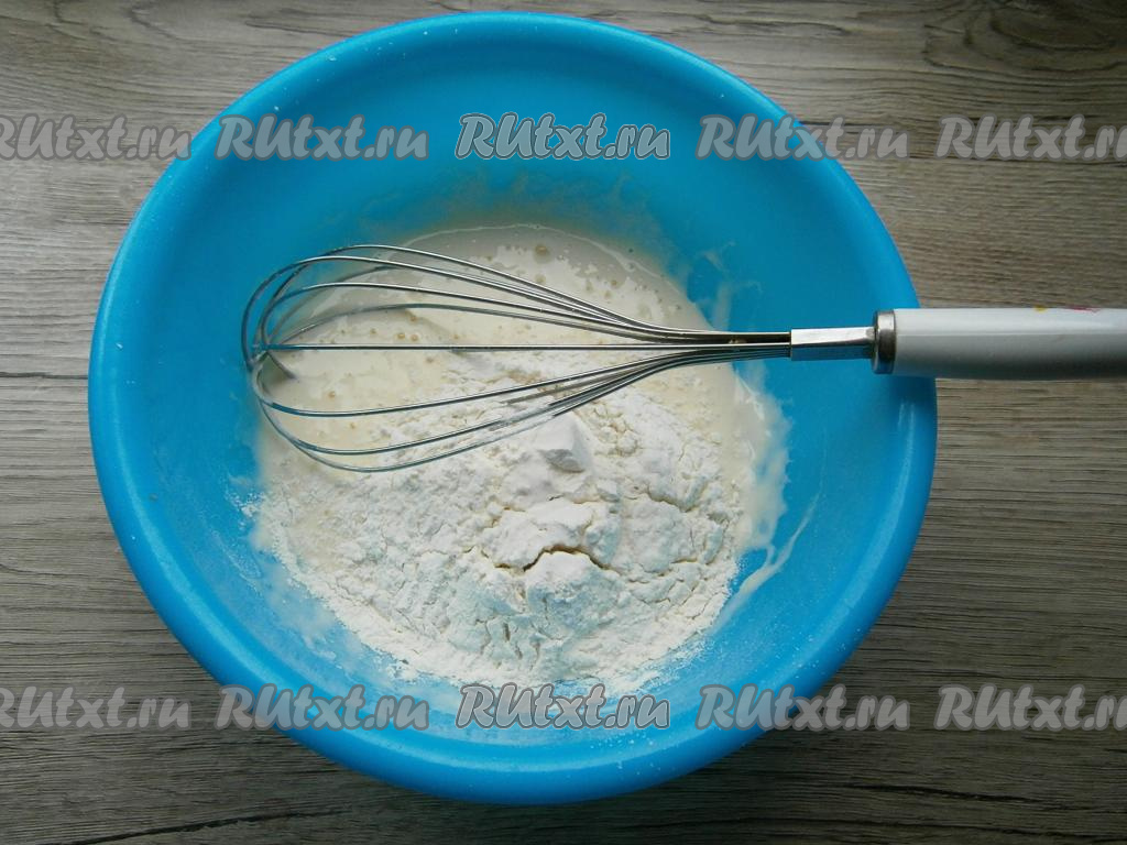 Хорошо размешать венчиком. Всыпать муку.
