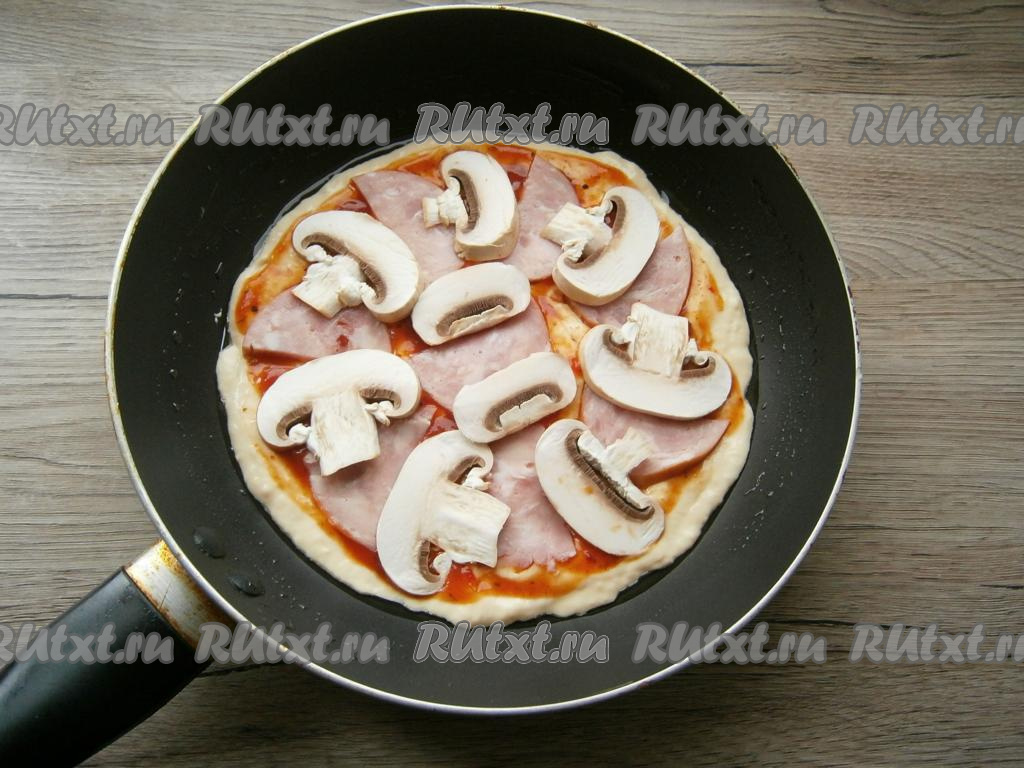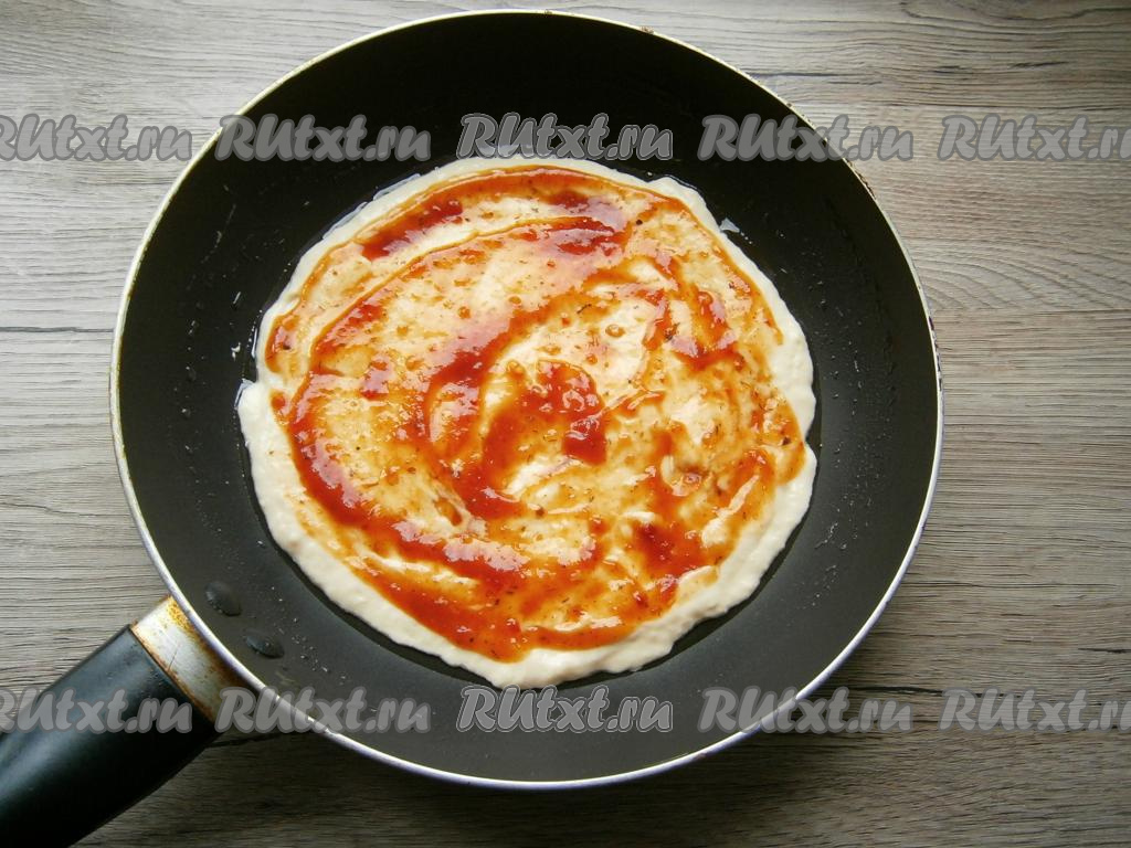 Холодную сковороду смазать растительным маслом. Выложить тесто и разровнять его по дну сковороды. Смазать тесто томатным соусом.
