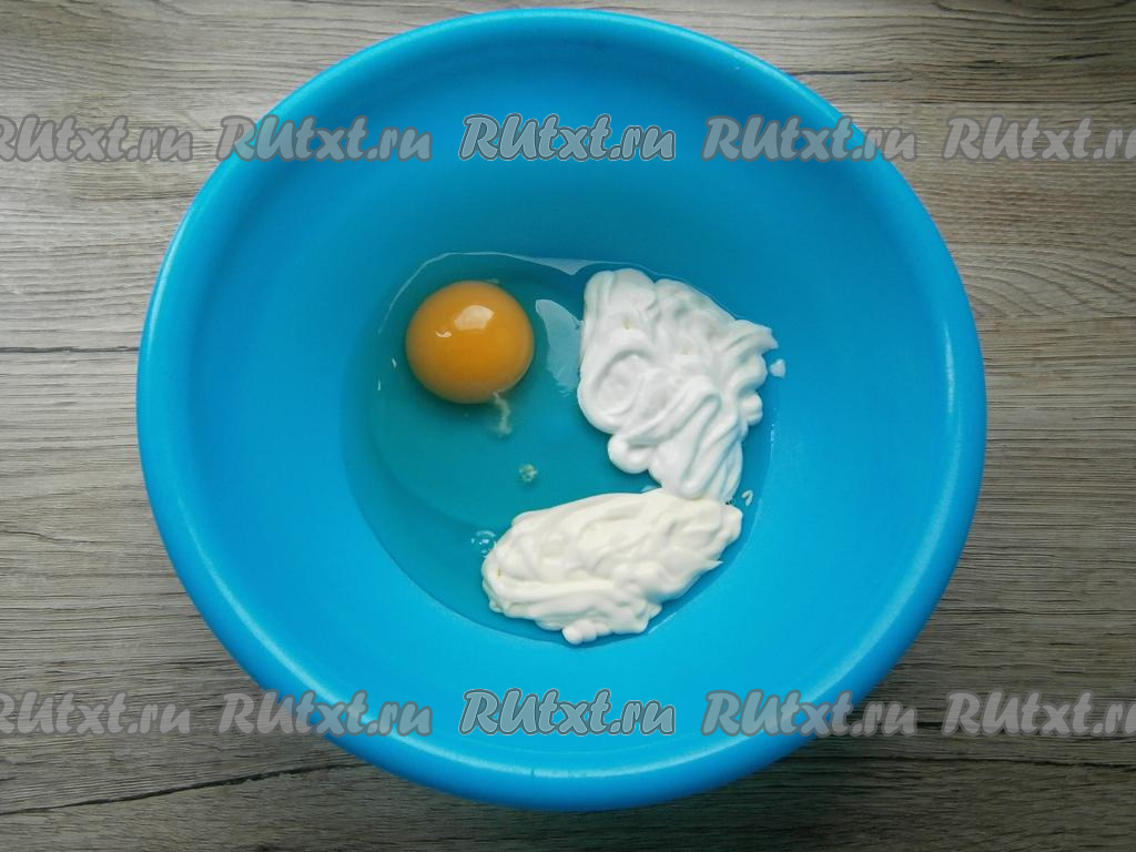 К сырому яйцу добавить майонез и сметану.