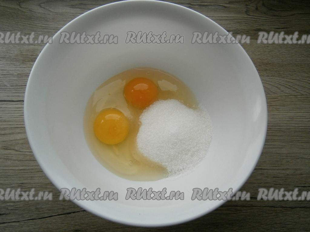 Для приготовления теста к яйцам добавить сахар, щепотку соли.