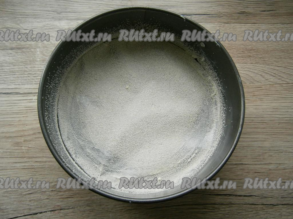 Застелить дно разъемной формы диаметром 18-20 см пергаментом, смазать всю форму сливочным маслом и посыпать манкой или мукой.