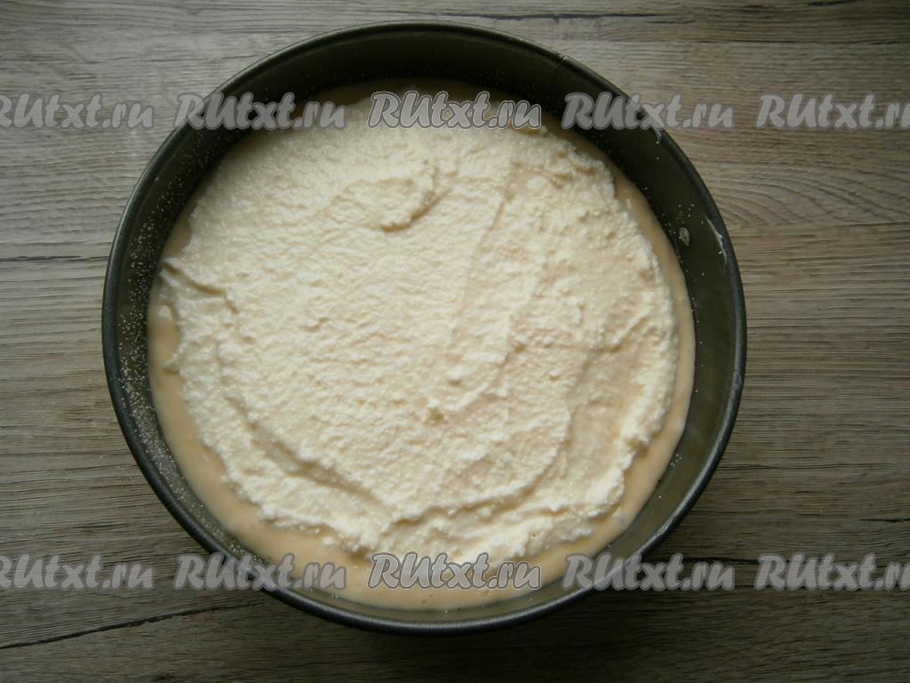 Выложить подготовленное тесто, сверху разместить творожную начинку, не доходя до краев теста.