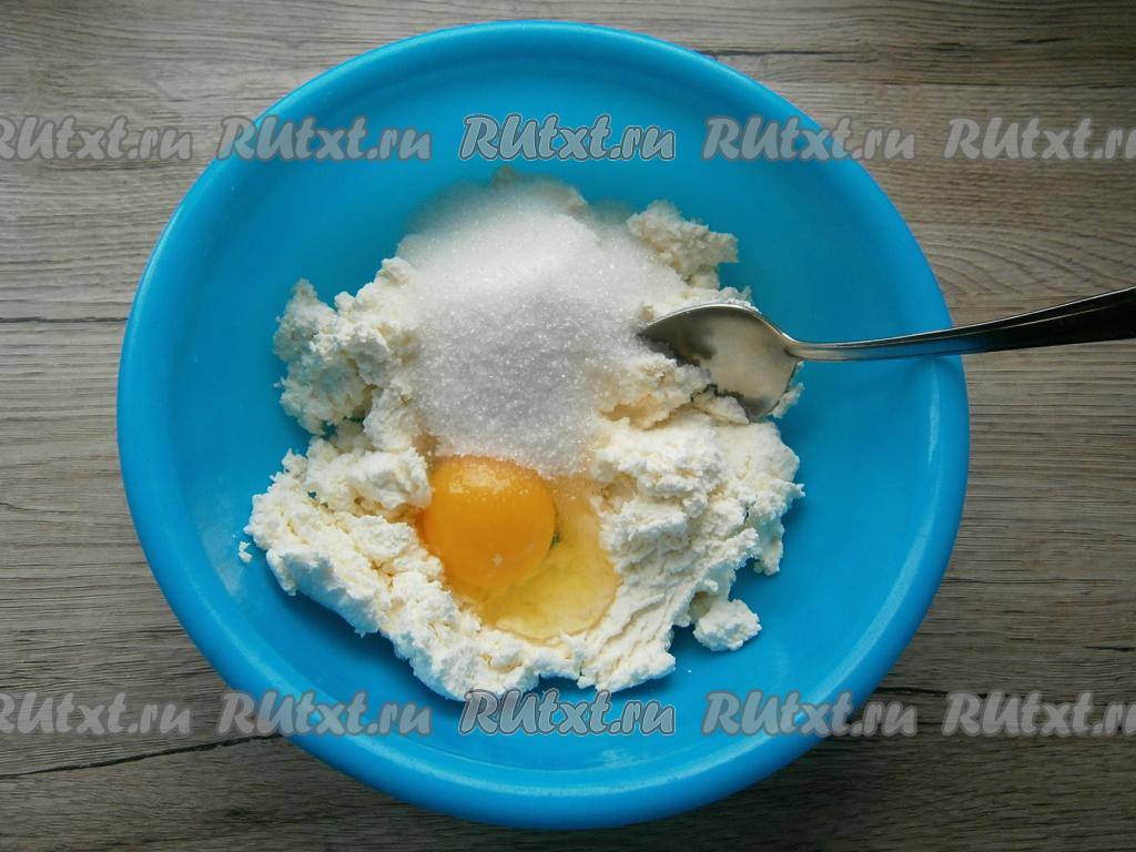 Для приготовления начинки в мягкий творог добавить сырое яйцо, всыпать сахар.