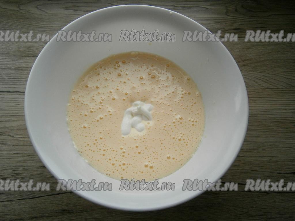 Взбить яйца миксером до светлого и пышного состояния, добавить сметану.