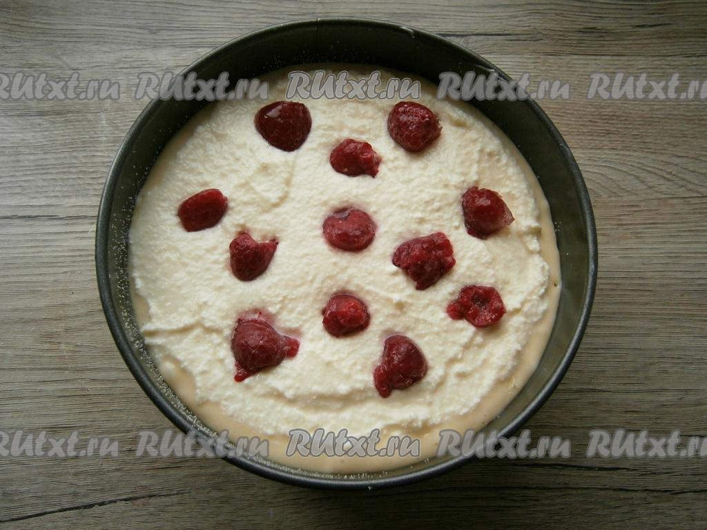 На творожную начинку выложить любые ягоды, немного их вдавливая.