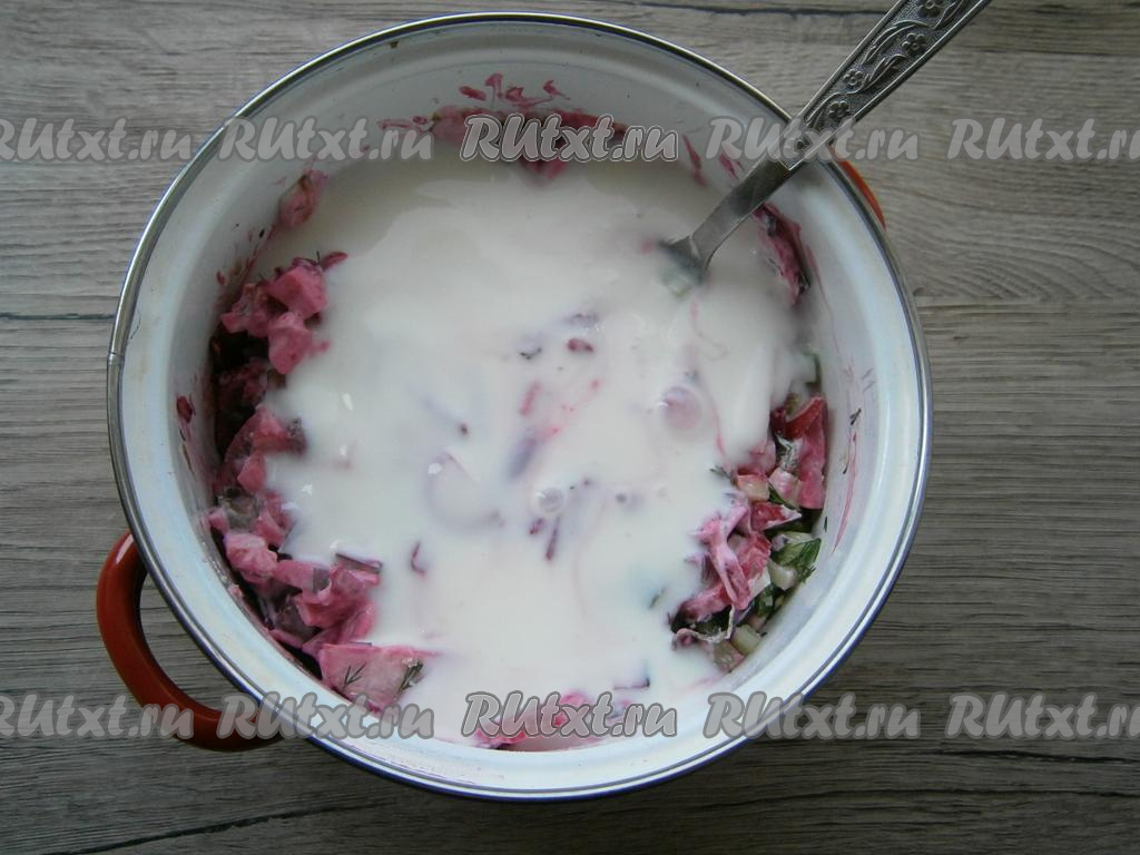 Влить в свекольник кефир (для этого блюда лучше брать нежирный кефир).