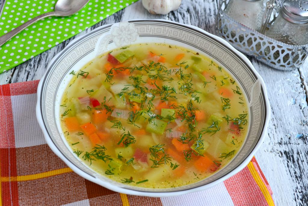 Вкусный, легкий, полезный овощной суп, приготовленный с кабачками, подать к столу в горячем виде.