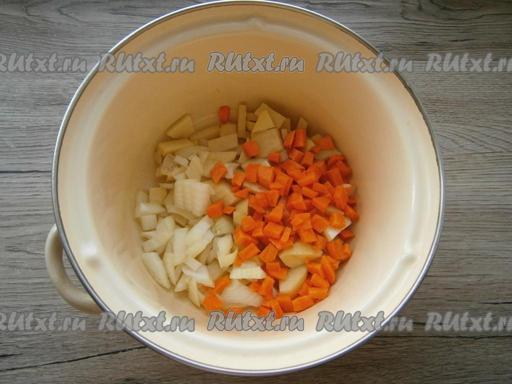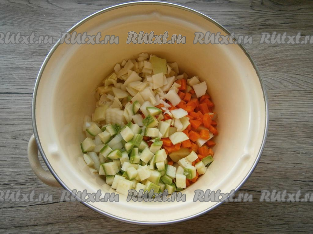 Картошку, морковь и лук очистить. Молодой кабачок можно не очищать от кожуры. Из болгарского перца удалить семенную коробку. В кастрюлю нарезать кубиками или кусочками картофель, морковь и репчатый лук.