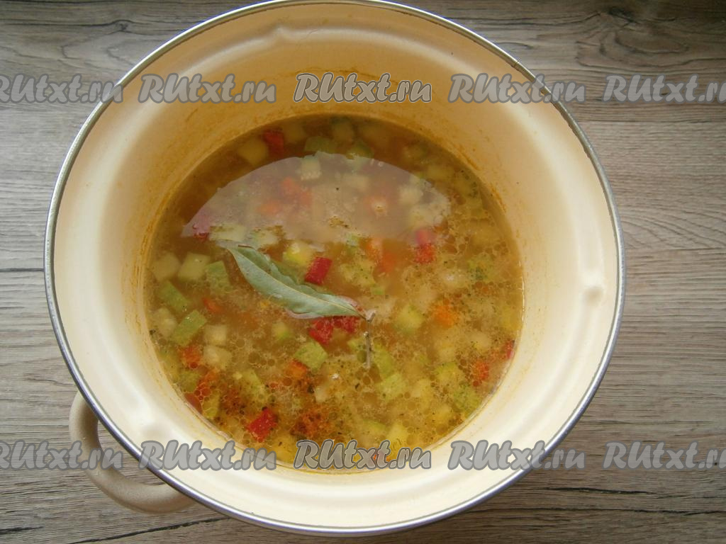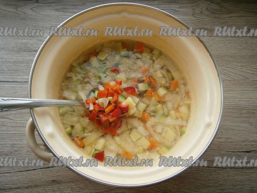 В кастрюлю с нарезанными овощами влить воду и отправить на огонь. После закипания воды уменьшить огонь, посолить по вкусу, влить растительное масло. Варить овощи около 25-30 минут, после чего добавить в суп нарезанный небольшими кусочками сладкий болгарский перец.