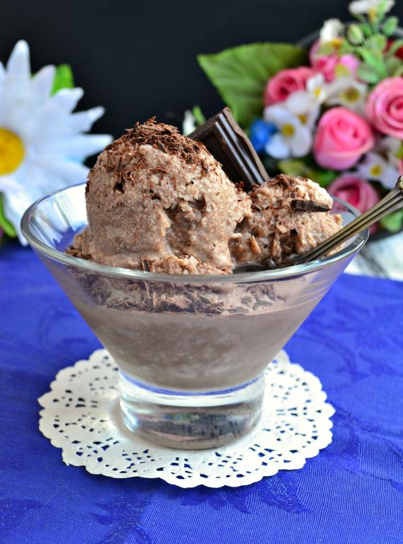 Очень вкусное, ароматное, прохладное шоколадное мороженое, приготовленное в домашних условиях, выложить в креманку, украсить тертым шоколадом (или чем-либо другим на ваше усмотрение) и подать к столу.