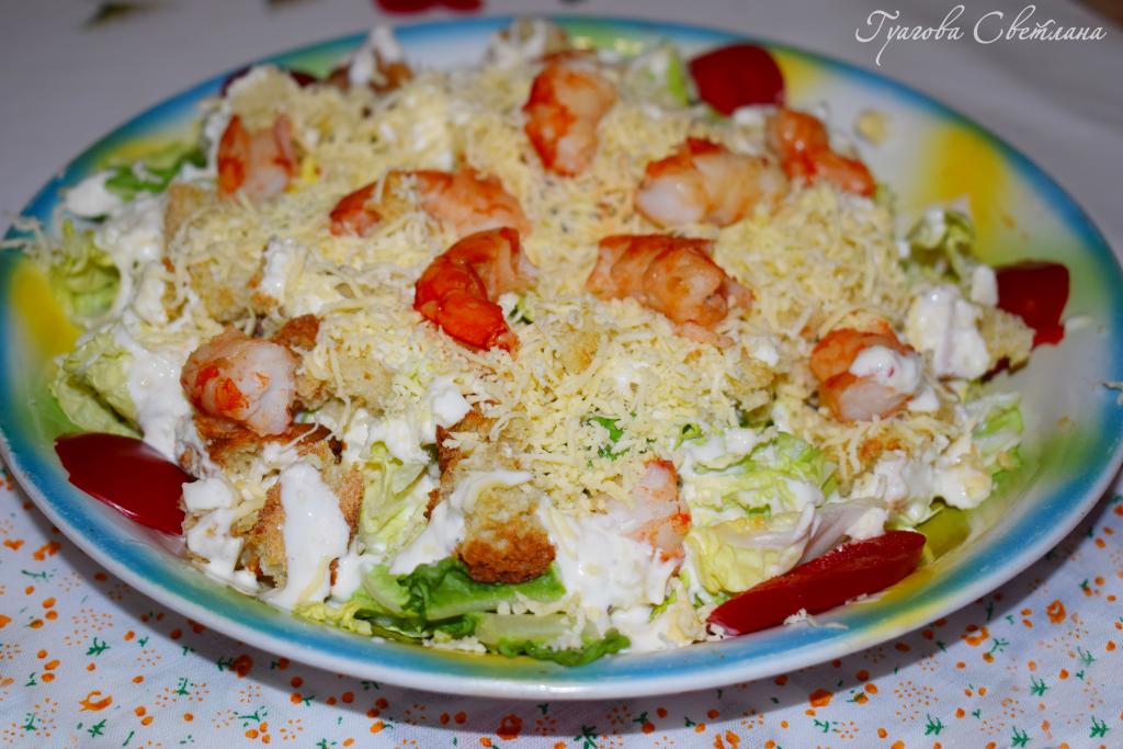 Далее выкладываем сухарики и болгарский перец (или помидоры черри), опять поливаем соусом. Посыпаем салат сыром. Креветки выкладываем поверх сыра (если креветки крупные, как у меня, то предварительно нарежьте их на кусочки равного размера). Украшаем салат болгарским перцем и подаем к столу. Все компоненты этого блюда прекрасно гармонируют между собой, поэтому салат "Цезарь" с сухариками и креветками получается ярким и очень вкусным. Салат, приготовленный по этому рецепту, станет украшением стола и в будни, и праздники, обязательно попробуйте!
