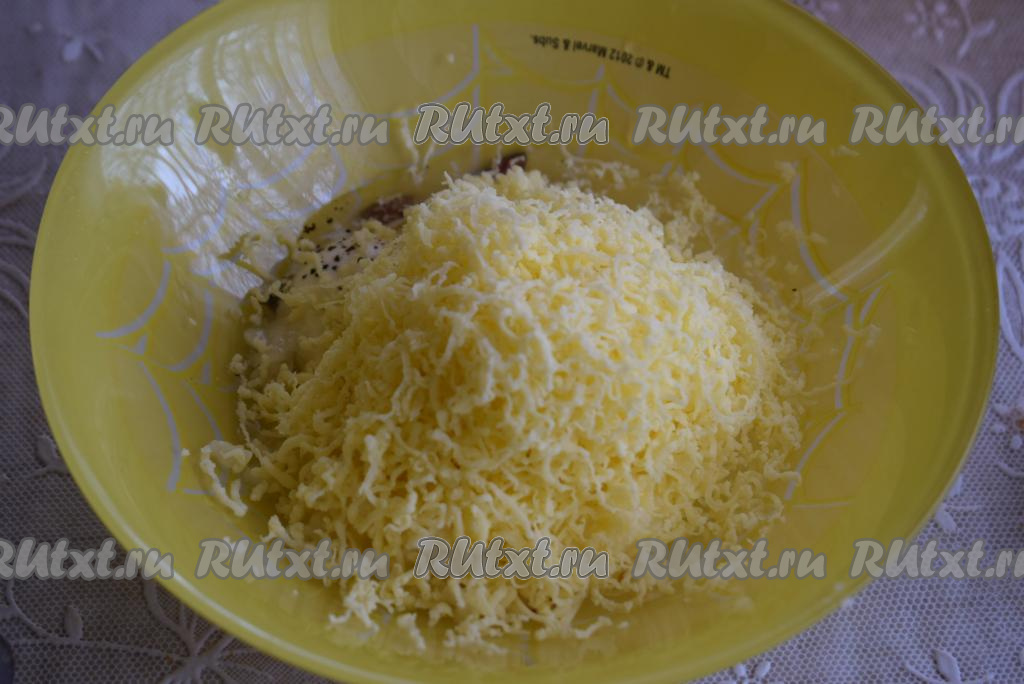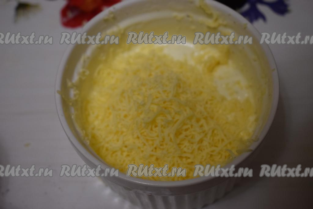 Натрем сыр для салата на мелкой терке, нарежем болгарский перец (или помидоры черри) на небольшие дольки.