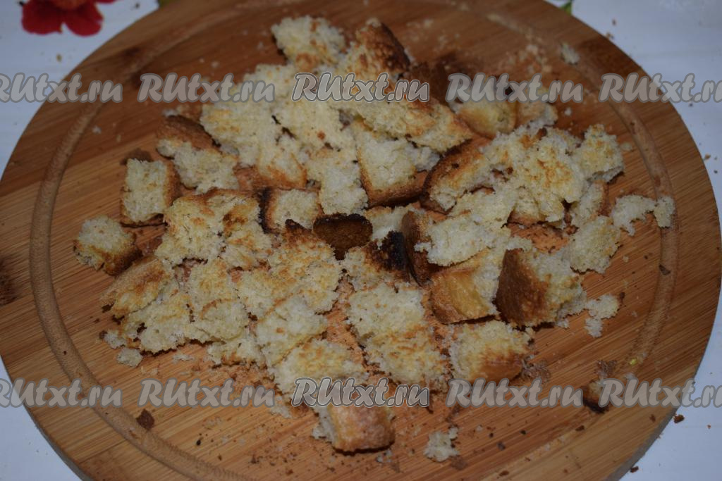 Далее приготовим сухарики для салата, для этого можно подсушить хлеб в тостере и затем нарезать на кусочки (именно так я и приготовила сухарики). Можно приготовить сухарики и на сковороде, для этого хлеб, нарезанный на кусочки, нужно подсушить на сухой сковороде до хрустящего состояния и румяного цвета с двух сторон. Любой из перечисленных способов приготовления хорош, в результате получаются нежные и вкусные сухарики. Даем сухарикам остыть.