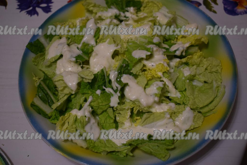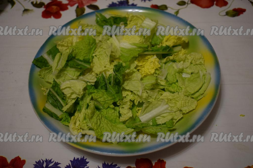Приступаем непосредственно к приготовлению салата "Цезарь" с креветками и сухариками. Для этого пекинскую капусту нарезаем на крупные квадраты. Кладем капусту в тарелку, в которой планируется подавать салат.