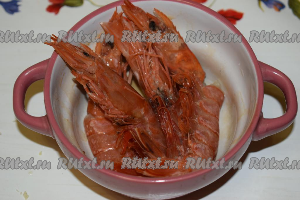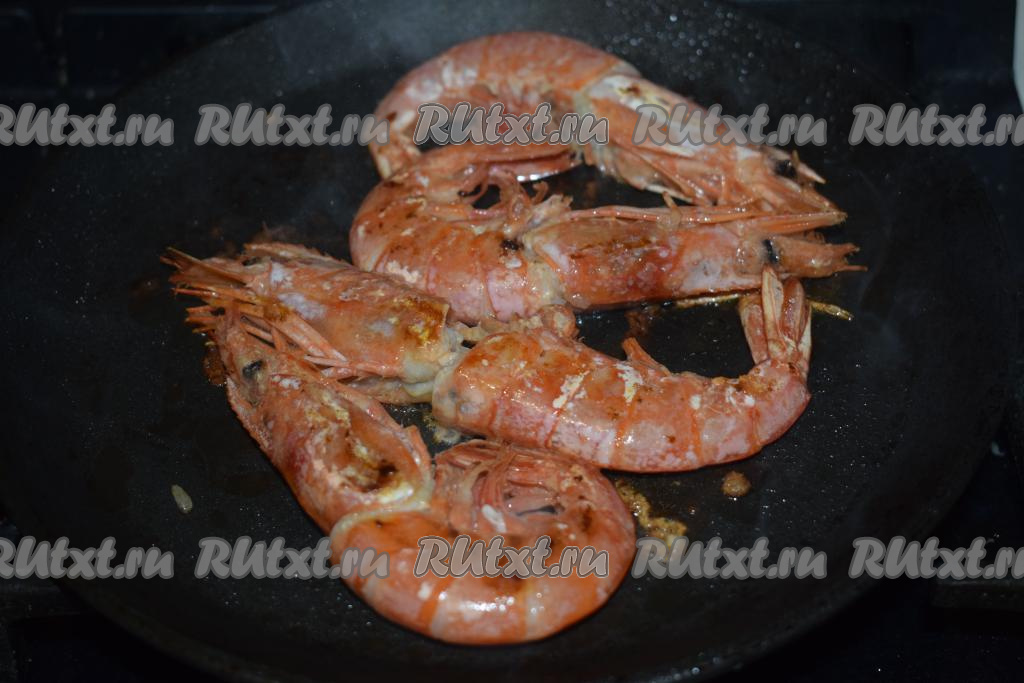 Затем сливаем сок, выделившийся из креветок. На сковороде, разогретой с растительным маслом, на среднем огне обжариваем креветок прямо в панцире с двух сторон (примерно, по 2-3 минуты с каждой стороны).