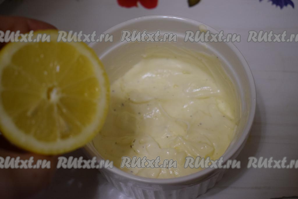 К майонезу добавляем сок, выжатый из половины лимона, и растительное масло, перемешиваем соус.