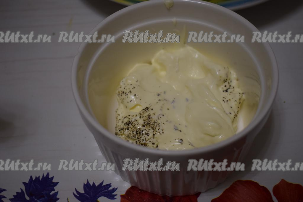 Для начала приготовим соус для заправки салата "Цезарь", для этого в глубокую миску выкладываем майонез, солим и перчим его.