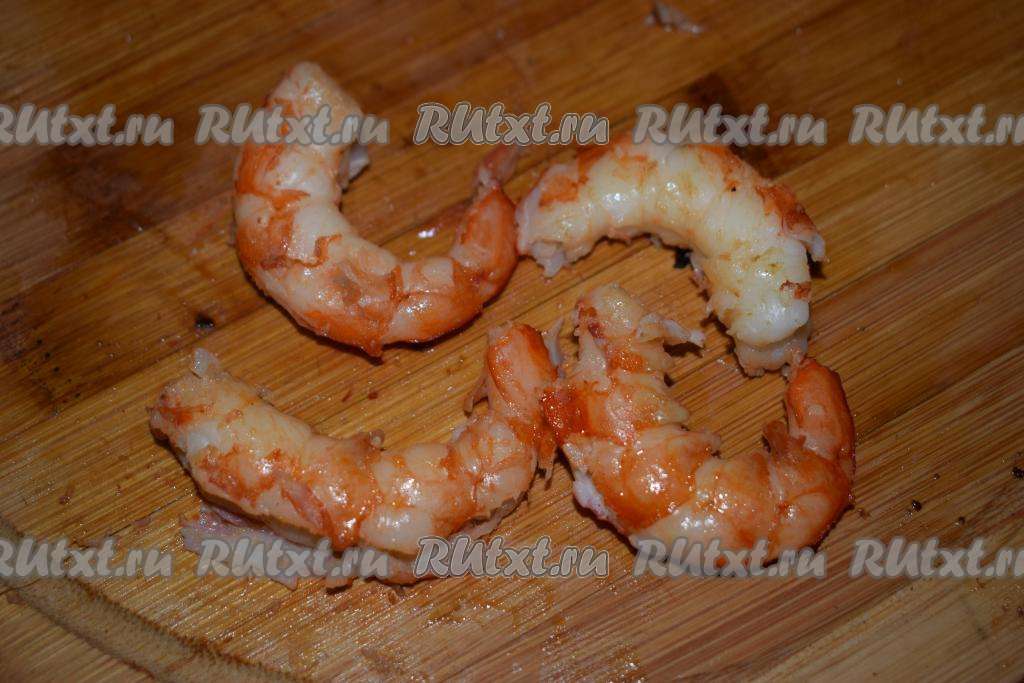 Готовые креветки снимаем со сковороды и охлаждаем. Очищаем креветки от панциря, удаляем кишку. Креветки для салата "Цезарь" готовы.