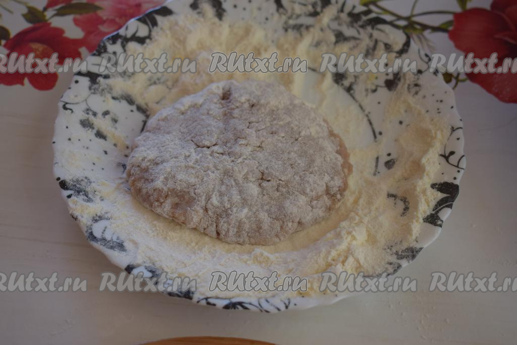 В отдельную тарелку насыпаем муку. Получившуюся отбивную обмакиваем со всех сторон в муку.