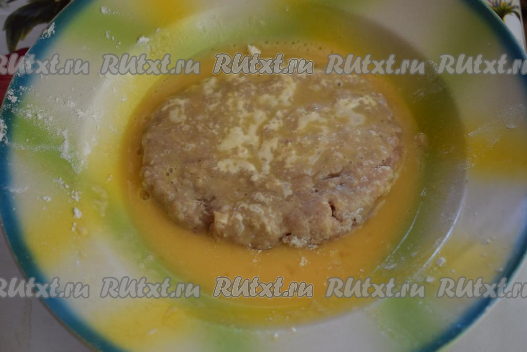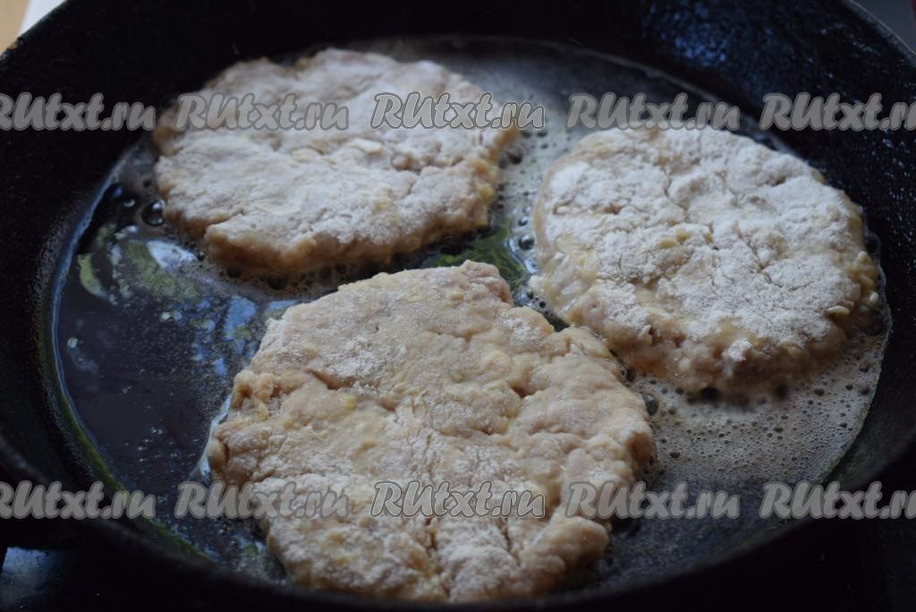 Подготавливаем (обваливаем в яйце и муке) столько отбивных из фарша за раз, сколько поместится одновременно на сковороде.