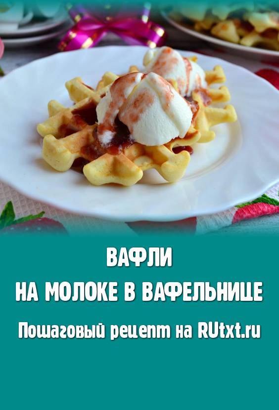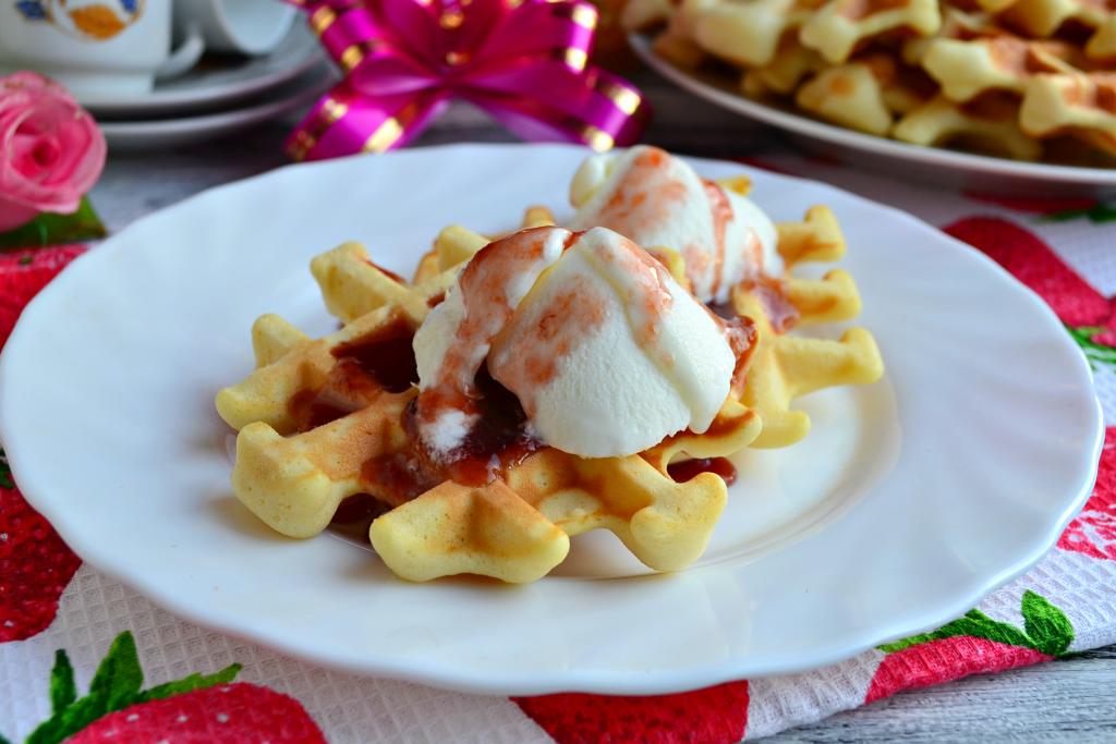 Подать вкуснейшие вафли, приготовленные на молоке в вафельнице, можно с шариком мороженого и вареньем.