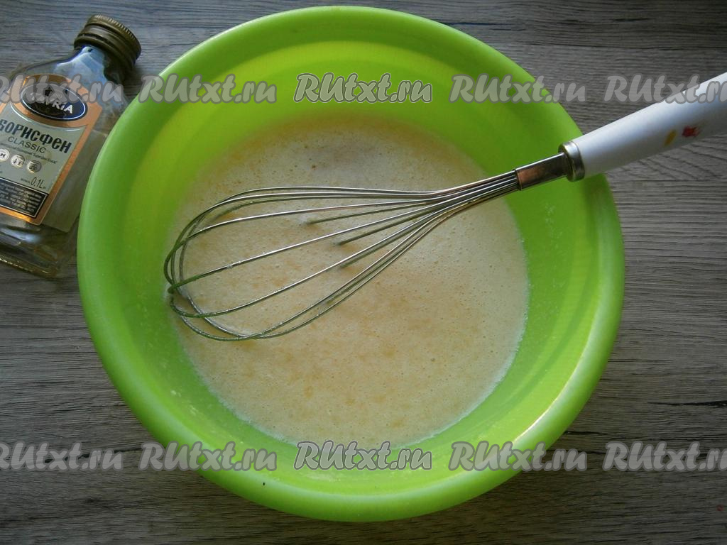 Взбить хорошенько венчиком, добавить растопленное остывшее сливочное масло, влить молоко комнатной температуры, коньяк, перемешать.