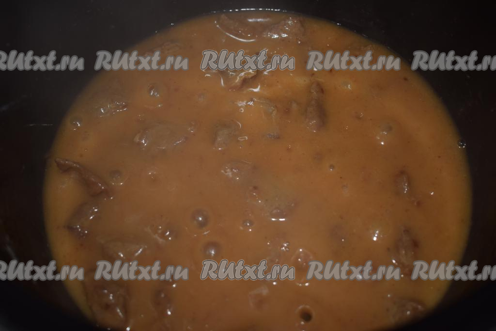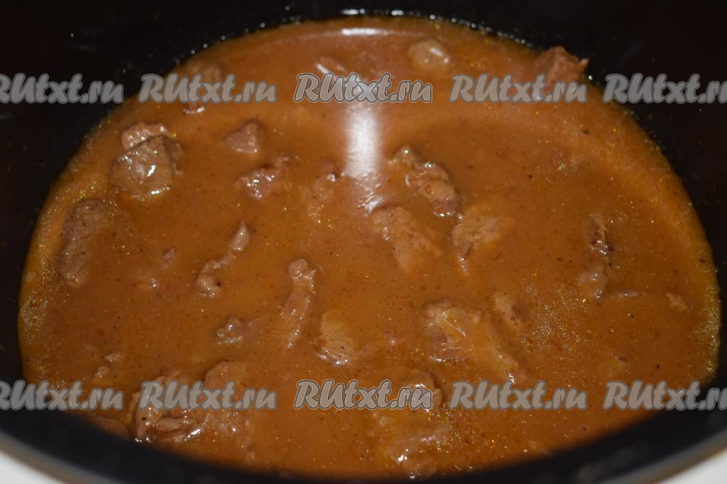 Влить в чашу мультиварки кипяченую воду (воды надо столько, чтобы она полностью покрывала говядину с луком), перемешать, подлива начнет густеть.