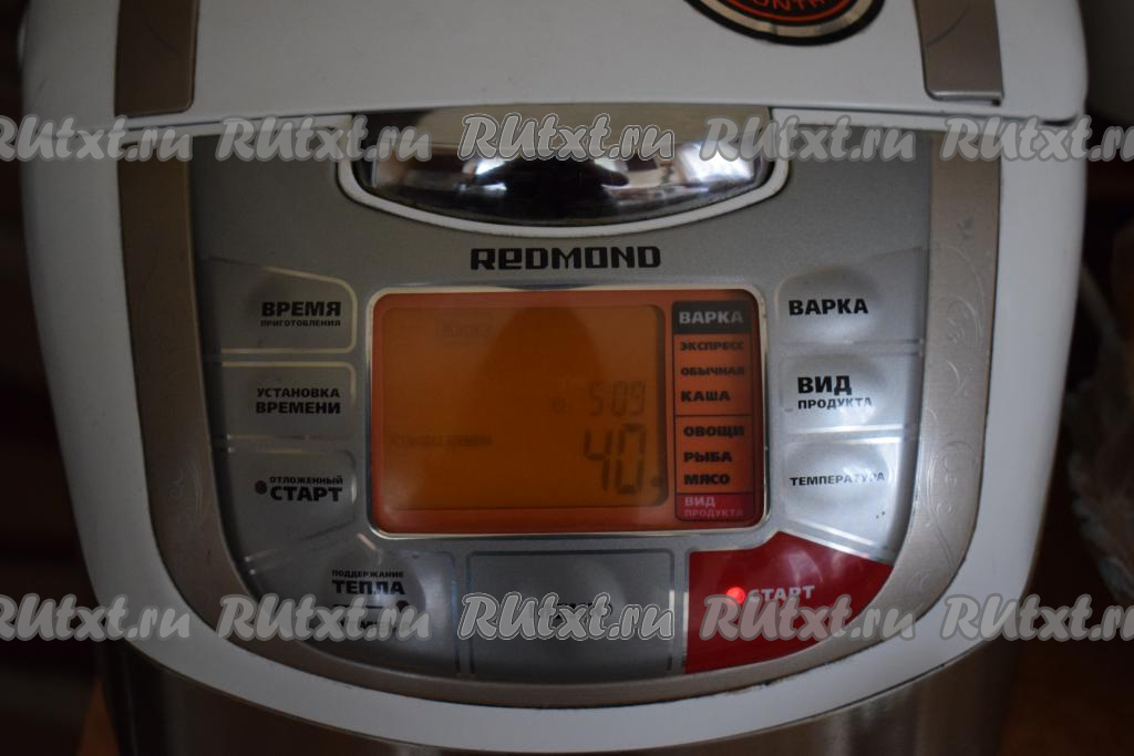 Мультиварку включить на режим "Жарка", выбрать вид продукта "Мясо" и дождаться, когда мультиварка начнет обратный отсчет.