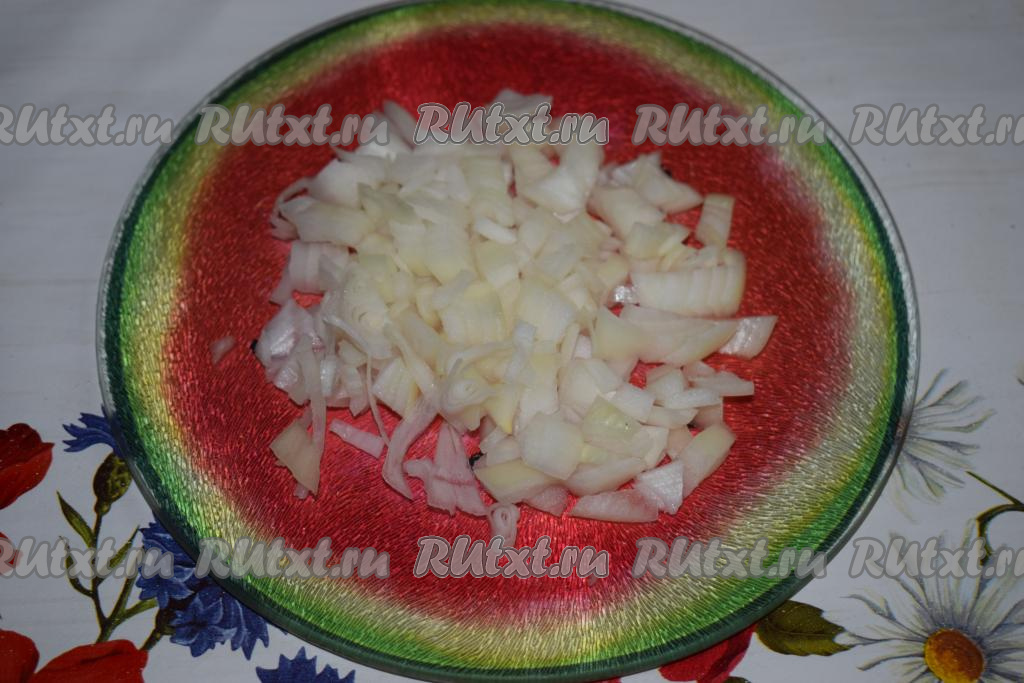 Затем крышку мультиварки закрыть и жарить говядину еще 10 минут. Пока мясо обжаривается, очистить лук и нарезать его на мелкие кубики.