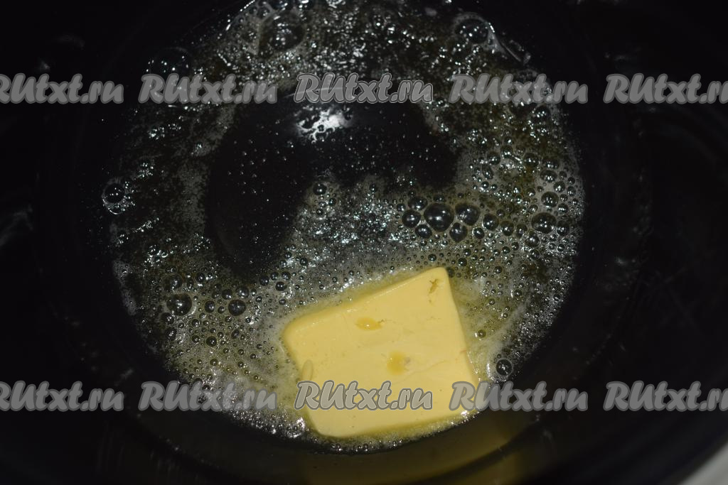 В чашу мультиварки налить растительное масло и добавить сливочное масло (желательно использовать домашнее сливочное масло, у него очень вкусный аромат и мясо в процессе готовки будет впитывать его в себя).