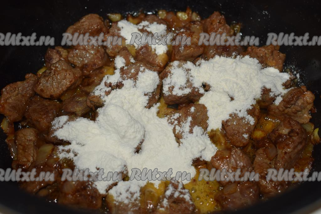 Когда лук станет прозрачным, всыпать муку, перемешать и обжарить её с говядиной и луком, постоянно помешивая, примерно, 5 минут.