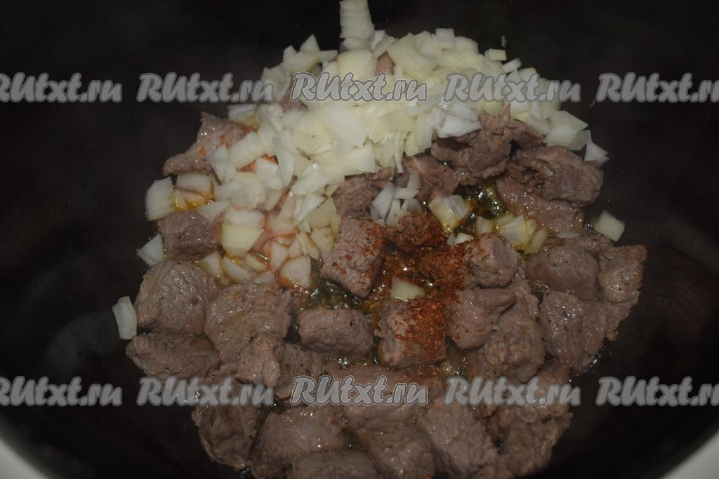 По истечении 10 минут открыть крышку мультиварки, если практически вся жидкость из говядины испарилась, значит пора добавлять измельченный лук, специи и паприку.