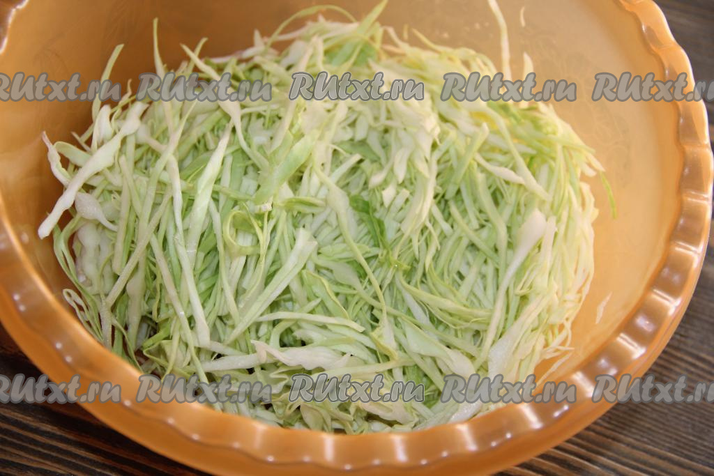 Капусту тонко нашинковать и слегка помять с солью.