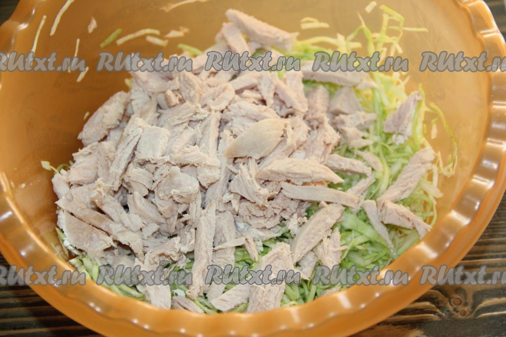 Куриную грудку отварить в подсоленной воде до готовности (в течение 30-40 минут), а затем остудить и нарезать на длинные брусочки или нарвать на волокна. Добавить куриное мясо к капусте.