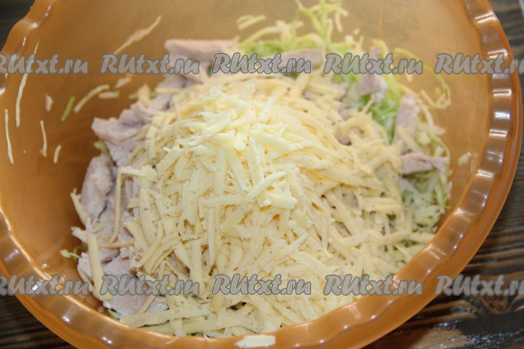 В салат из капусты и куриной грудки добавить сыр, натертый на крупной тёрке.
