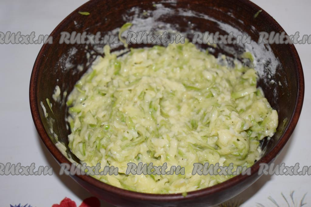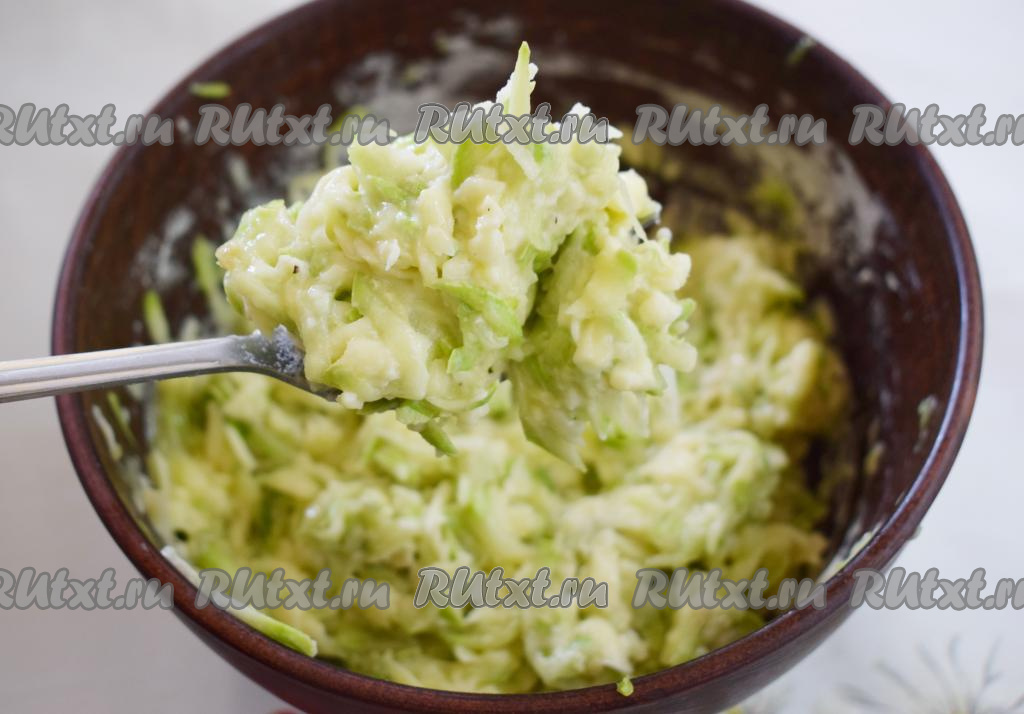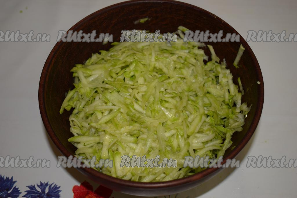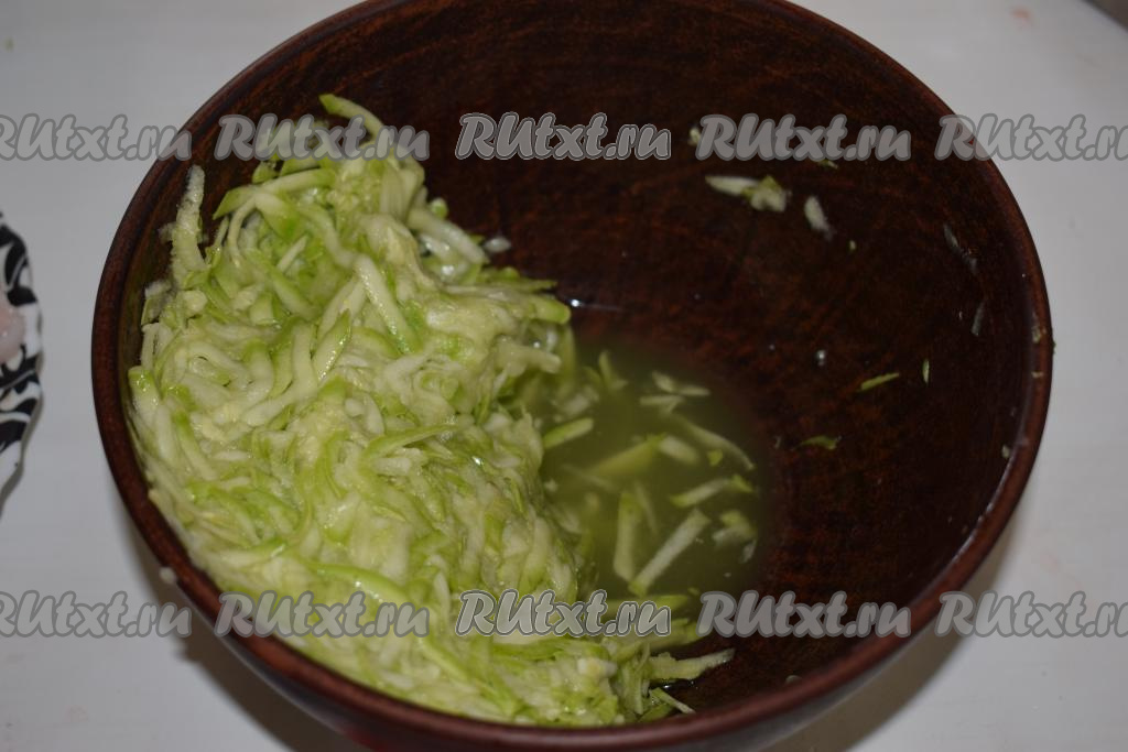 Солим натёртый кабачок и даем постоять 10 минут, для того чтобы он пустил сок. Отжимаем кабачковую массу, сливая выделившийся сок (сок нам в дальнейшем не понадобится).