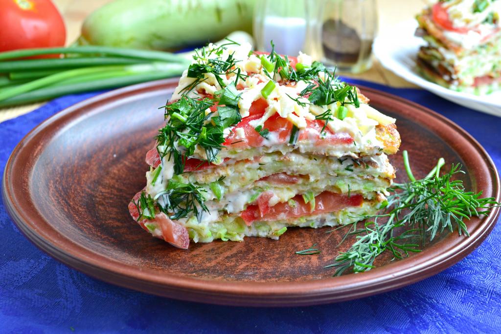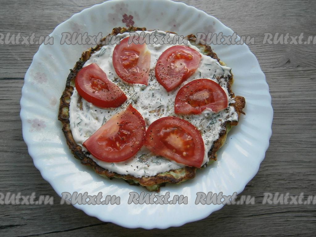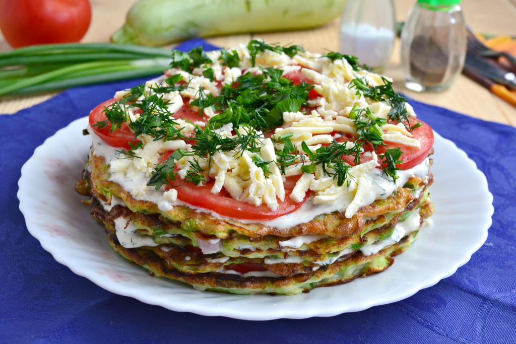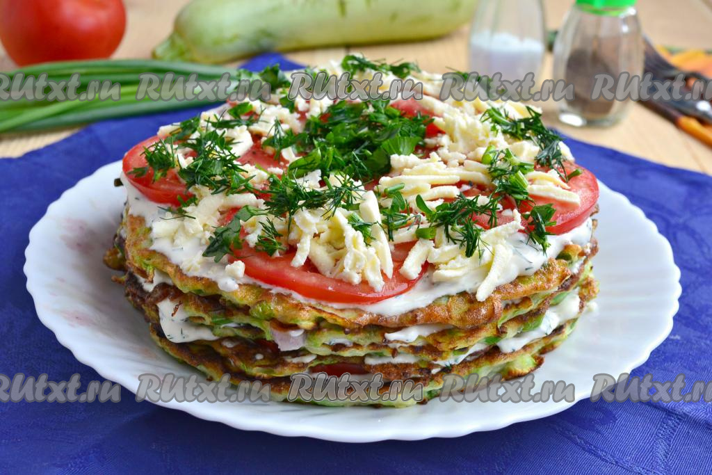 Каждый кабачковый блин смазать соусом, выложить тонкие дольки свежих помидоров, которые немного посолить и поперчить. Сложить кабачковые блины с помидорами друг на друга, формируя торт.