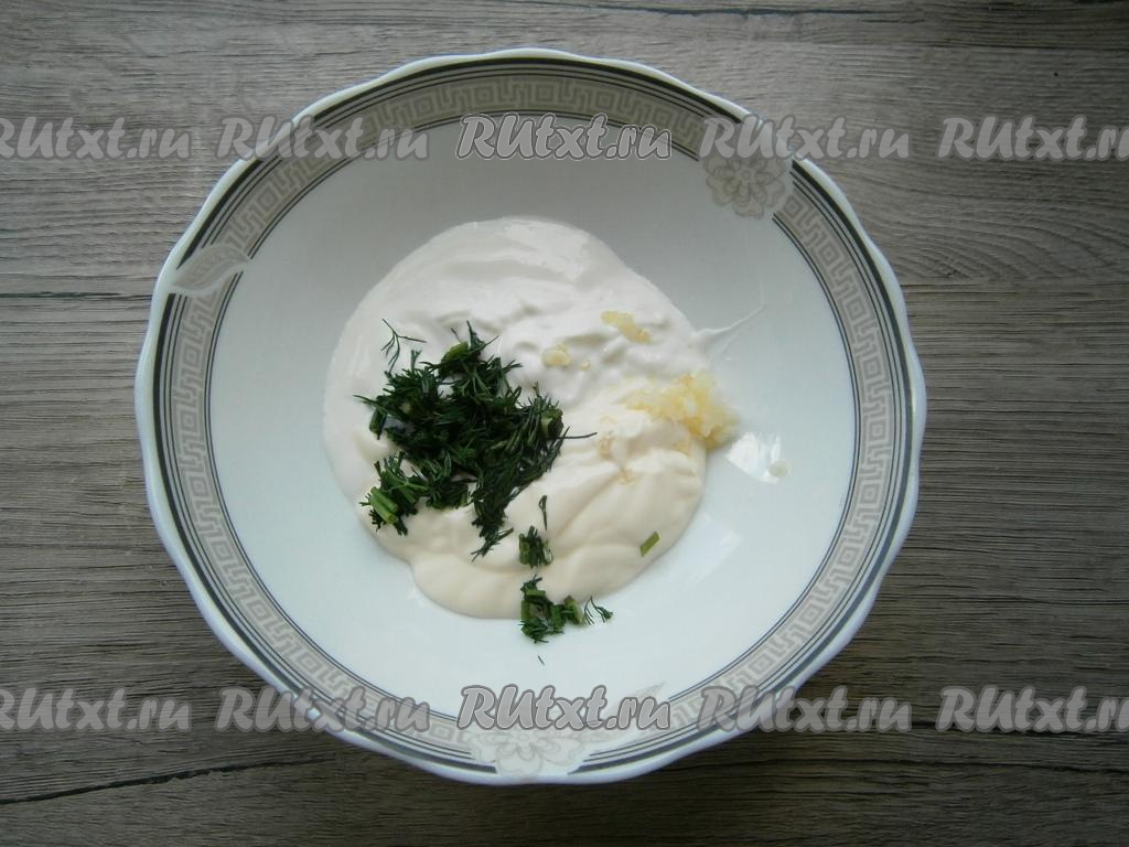Соединить майонез и сметану, добавить измельченный укроп и пропущенный через пресс чеснок, перемешать получившийся соус.