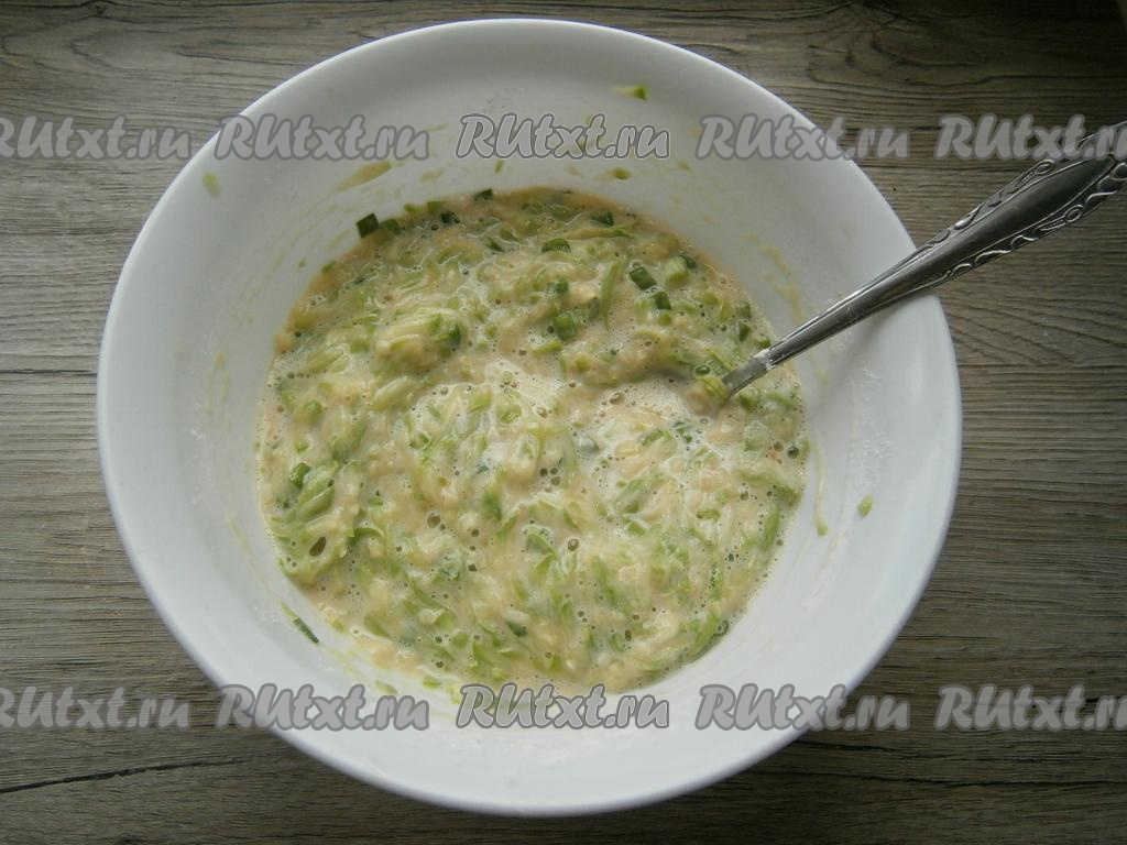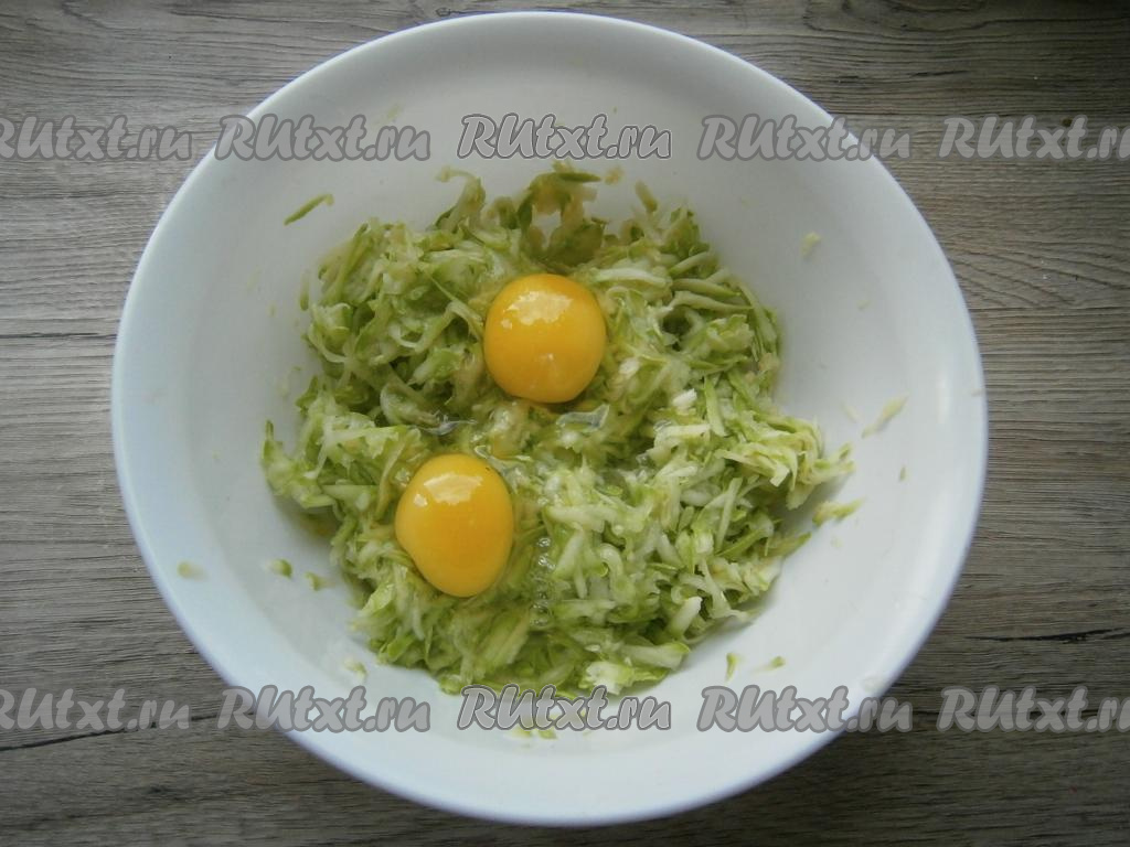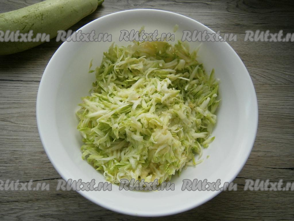 Кабачки натереть на крупной терке (если кабачки не очень молодые, тогда семечки и кожуру лучше удалить), немного посолить, перемешать и отжать хорошенько от жидкости.