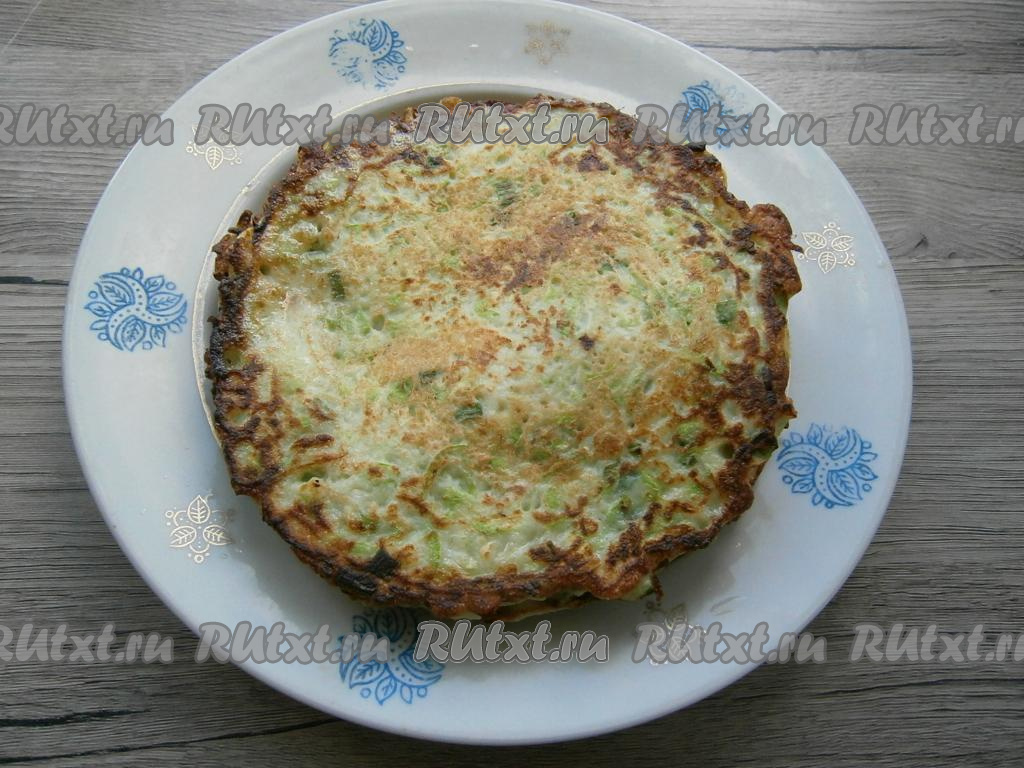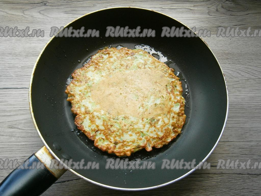 Жарить кабачковый блин на среднем огне до румяности с одной стороны, после чего перевернуть и жарить до румяного цвета с другой стороны. Аналогично пожарить все блины. У меня получилось 5 кабачковых блинчиков.