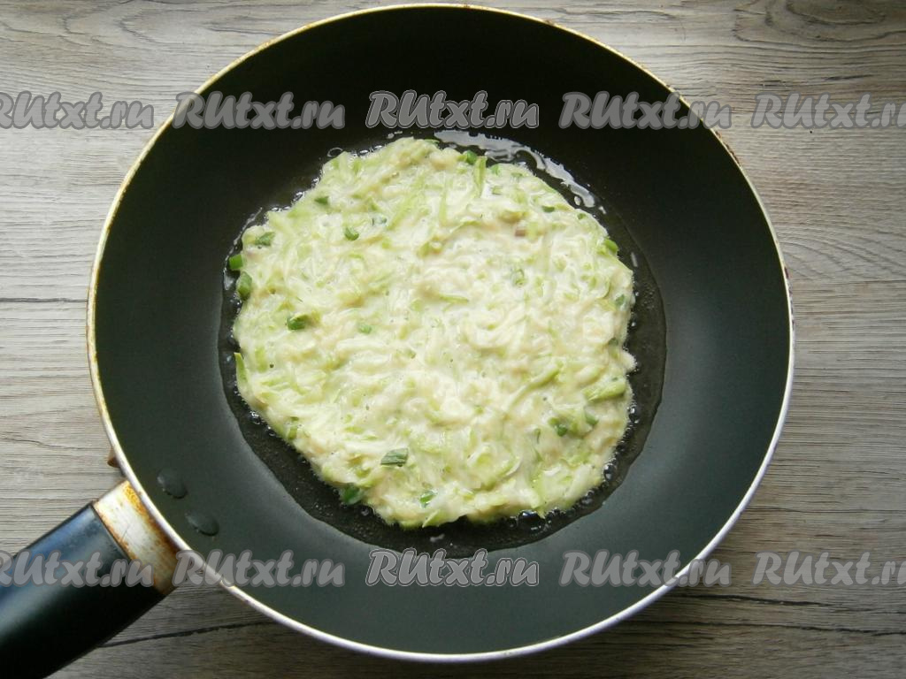 В разогретую сковороду влить растительное масло и выкладывать кабачковую массу столовой ложкой в центр, разравнивая и формируя блинчик.