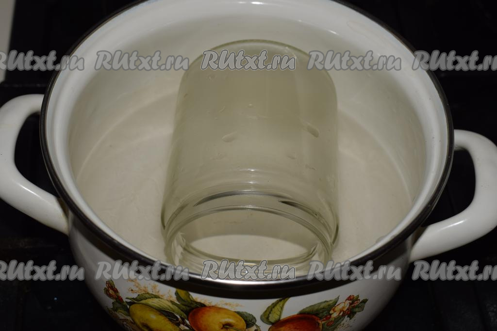 В это же время банки стерилизуем кипятком, для этого в кастрюлю небольшого объема наливаем воду, ставим банку на горлышко, включаем средний огонь и ждем, пока вода нагреется до горячего состояния.