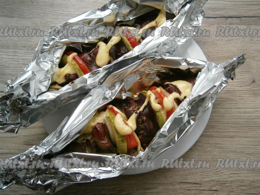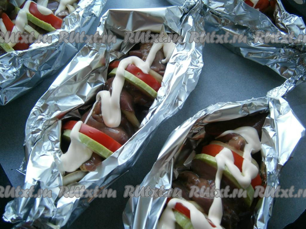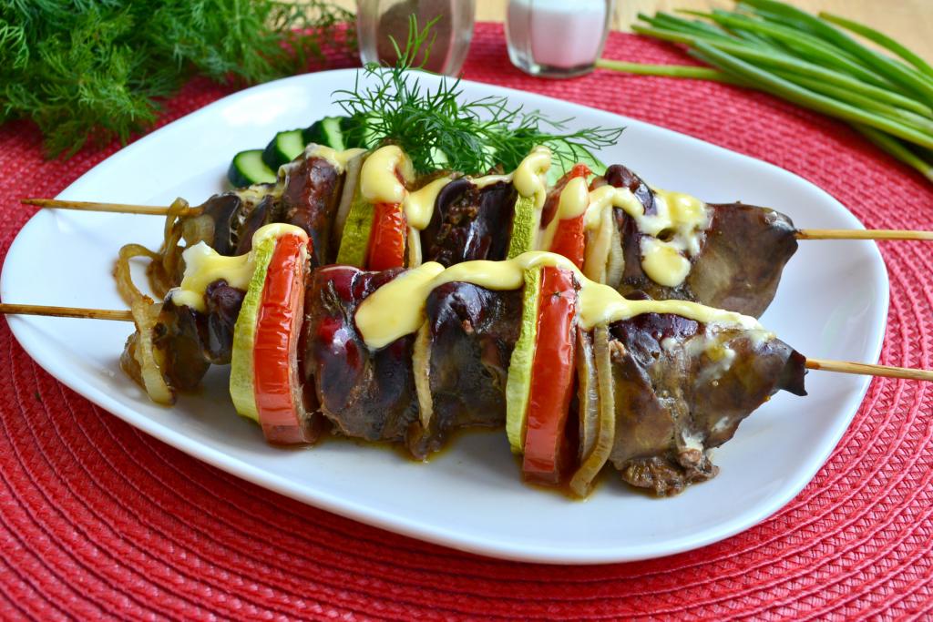 Далее нанизать кусочки куриной печени на деревянные шпажки или шампуры, поочередно с кружочками кабачка, свежего помидора и колечками лука. Если готовите в духовке, каждый шашлычок нужно поместить на фольгу, смазать сверху чуть майонезом.