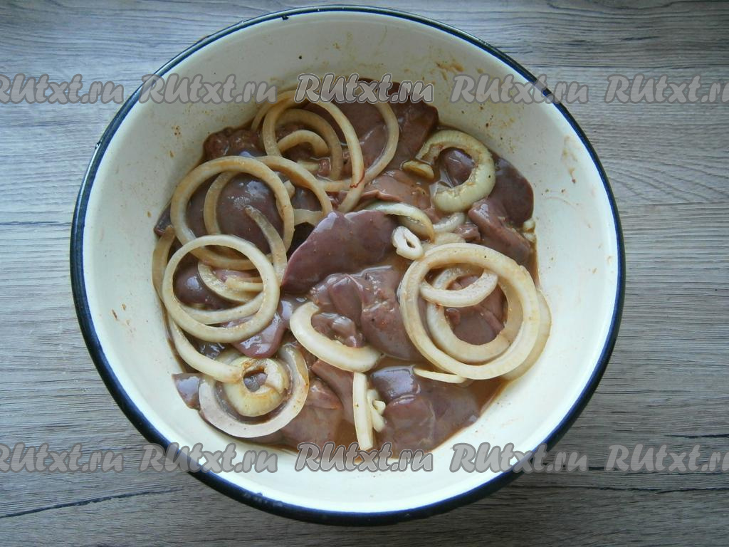 Если нужно, еще немного посолить и перемешать. Оставить печень на 1 час в прохладном месте.