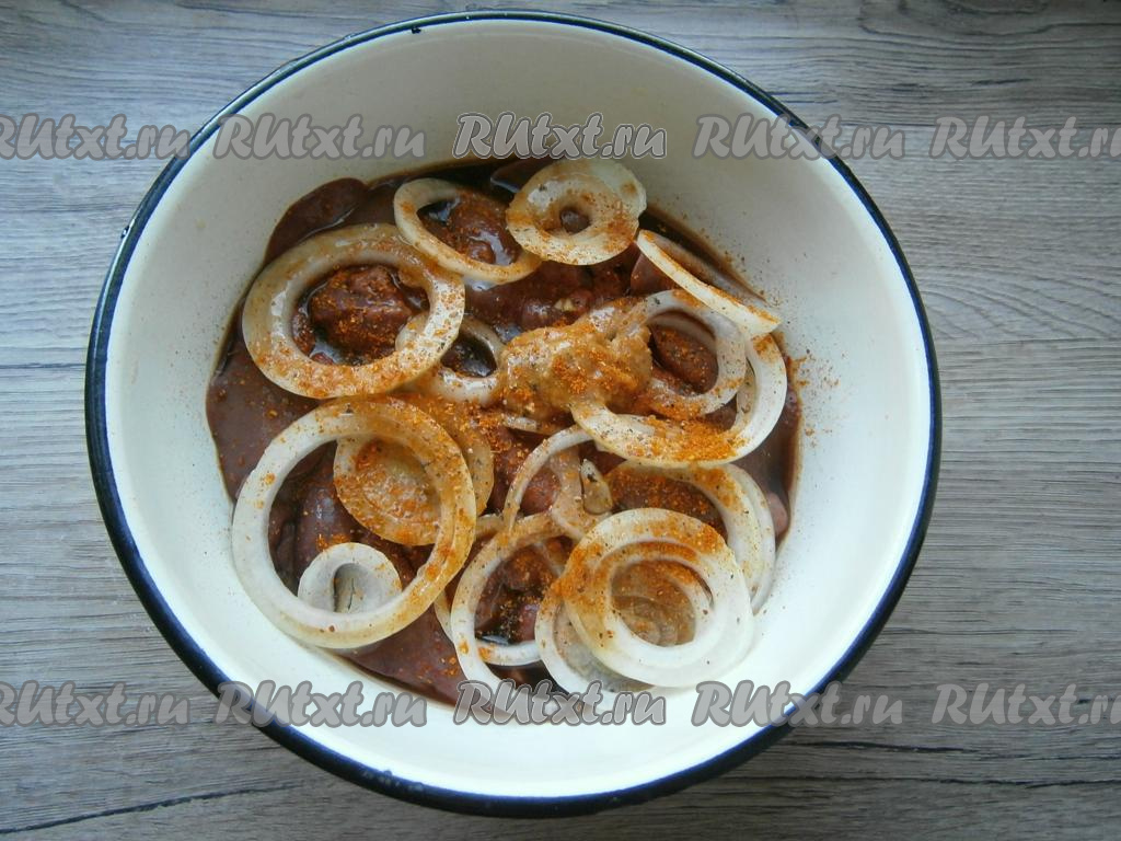 К печени добавить очищенный и нарезанный тонкими кольцами репчатый лук, горчицу, влить соевый соус.